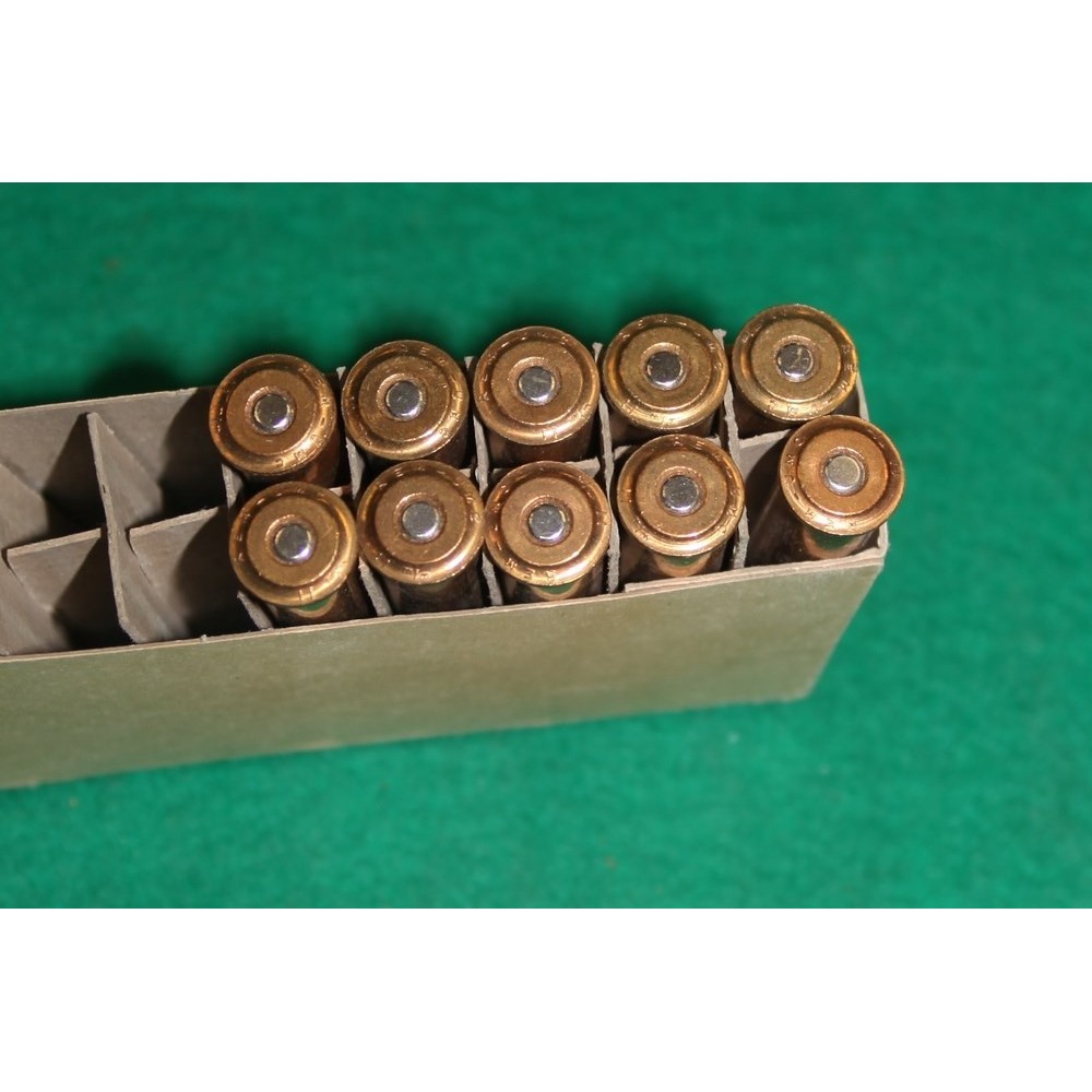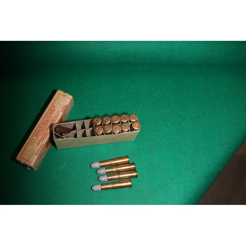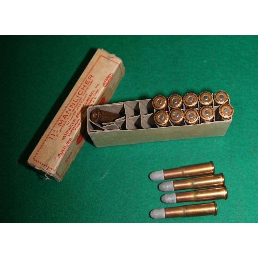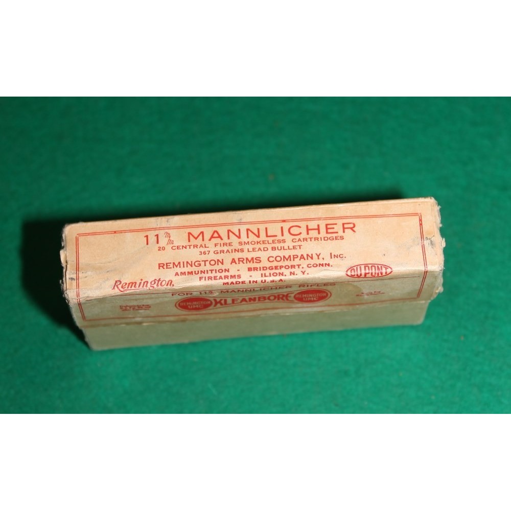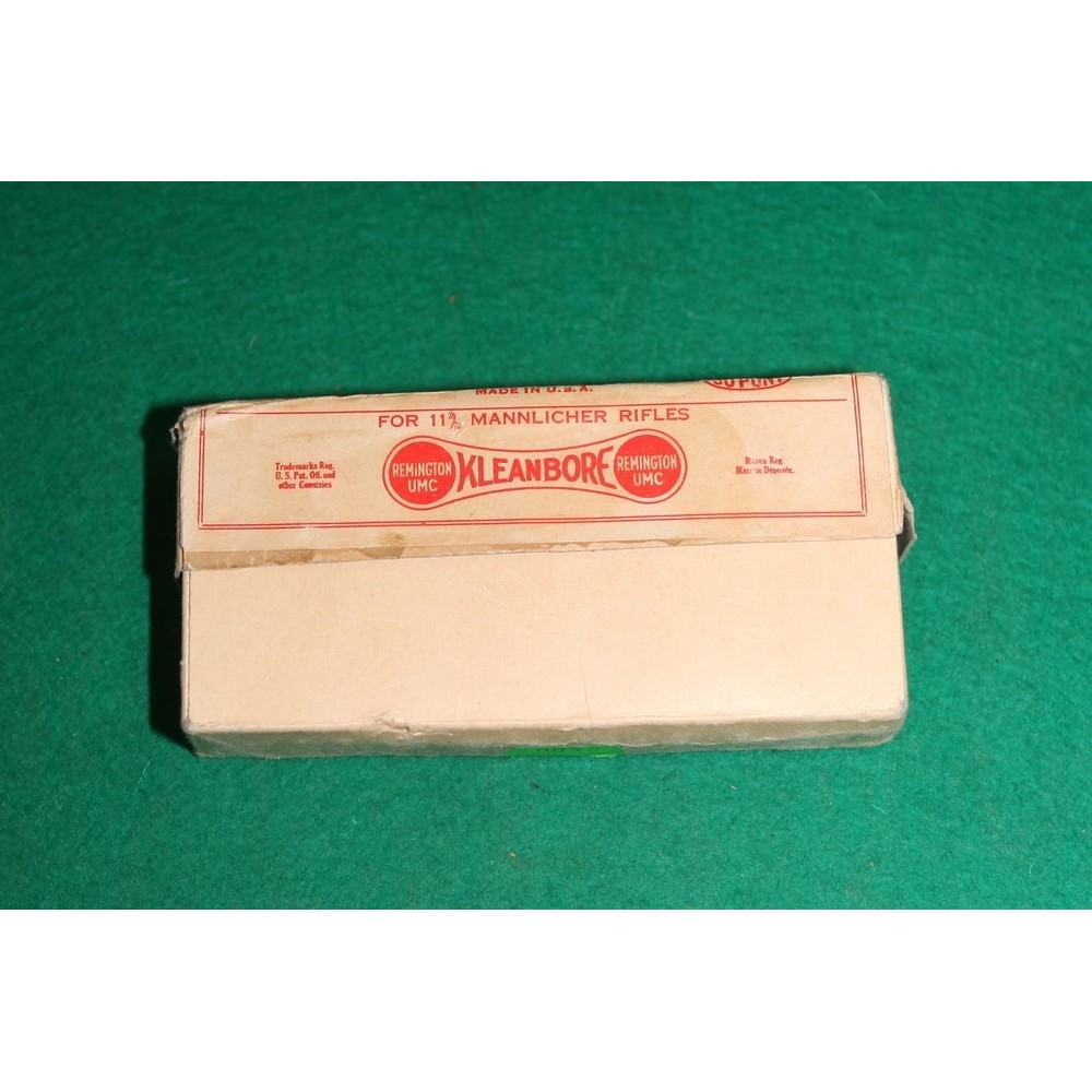 Krabička nábojů (bohužel ne plná, 5 ks chybí). Náboje 11 mm Mannlicher pro pušky Steyr 1888, ovšem vyrobené v USA firmou Kleanbore - Remington Arms. Krabička i náboje jsou v perfektním stavu, sbírkové.