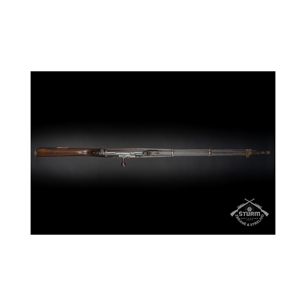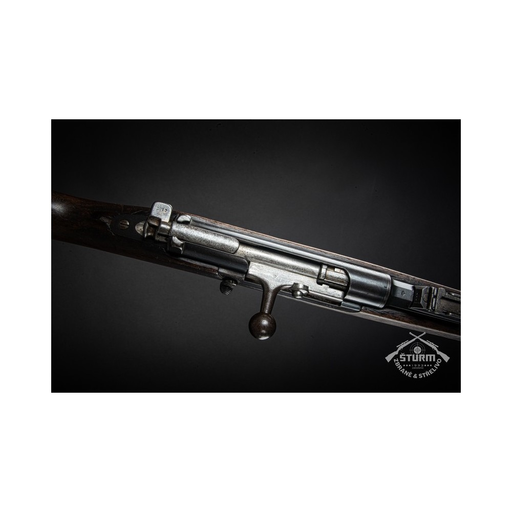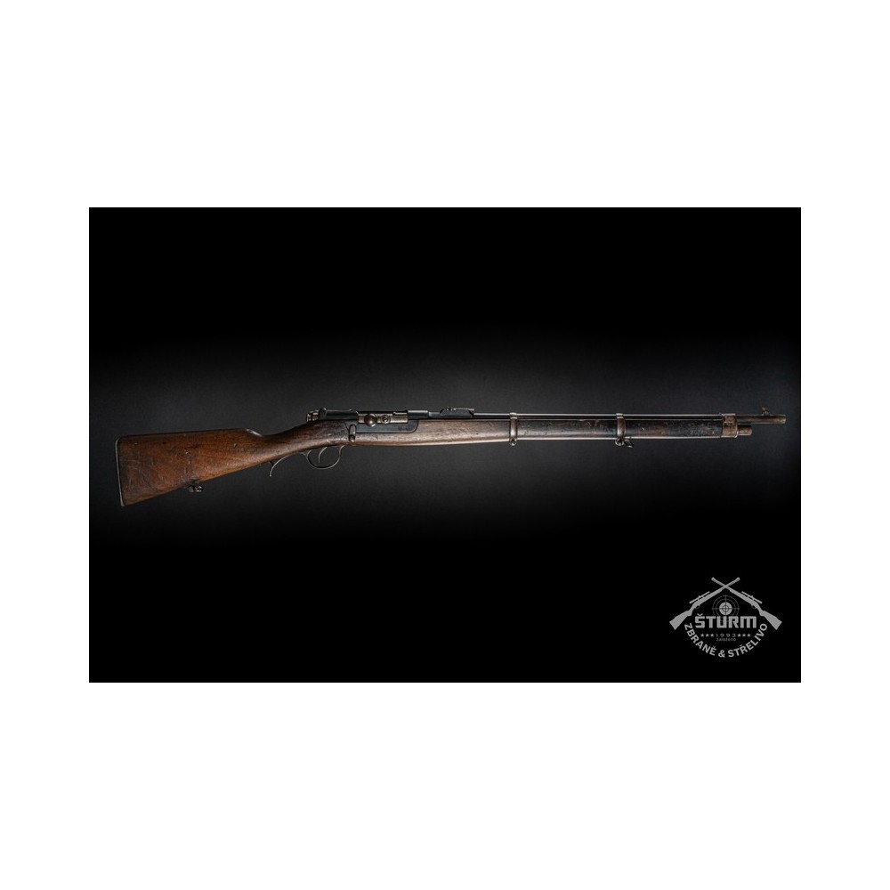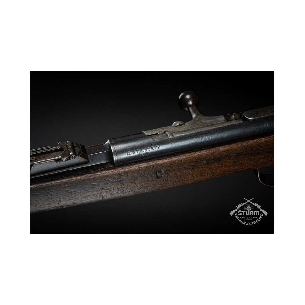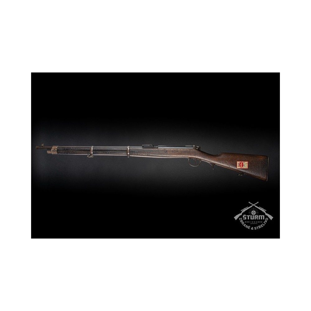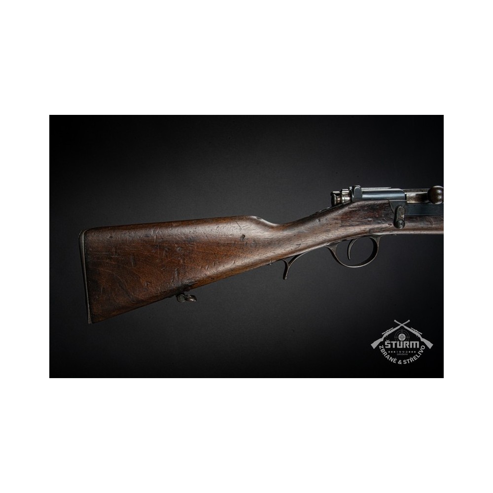 Opakovací puška Kropatschek M.1886, zkrácená, vzácně se vyskytující verze pro dělostřelce. Pažba se stopami používání, s čitelným a původním značením. Kovové části - v exponovaných místech setřený původní brynýr, historická patina. Střelbyschopný, platná zkušebna. Chybí vytěrák.