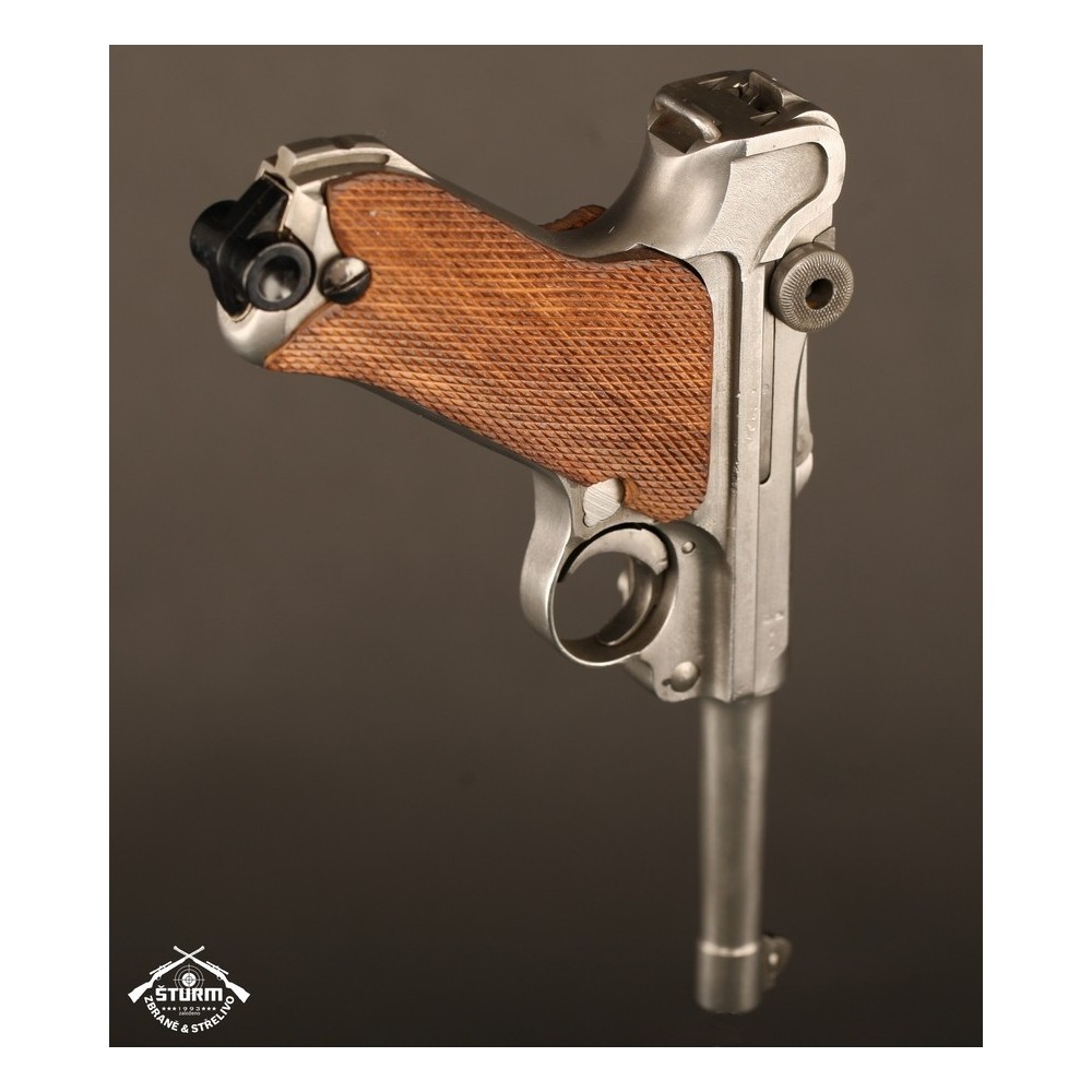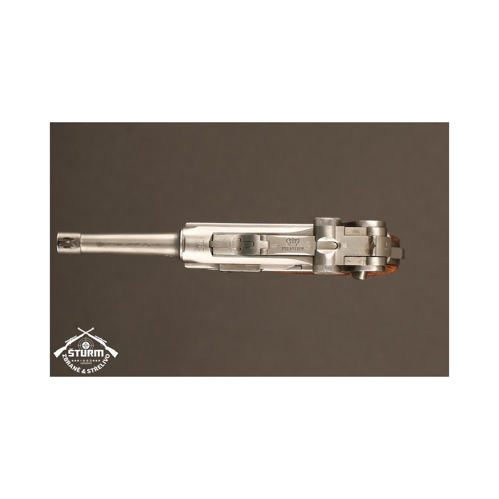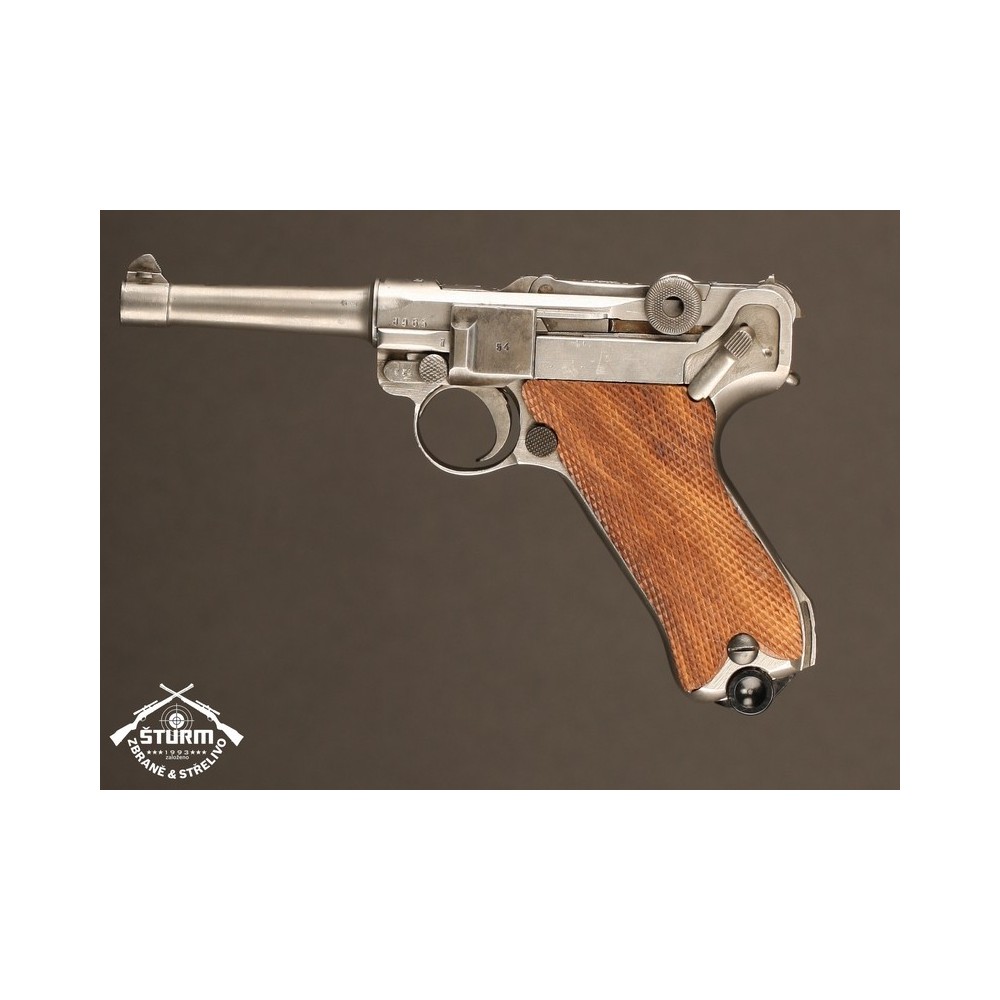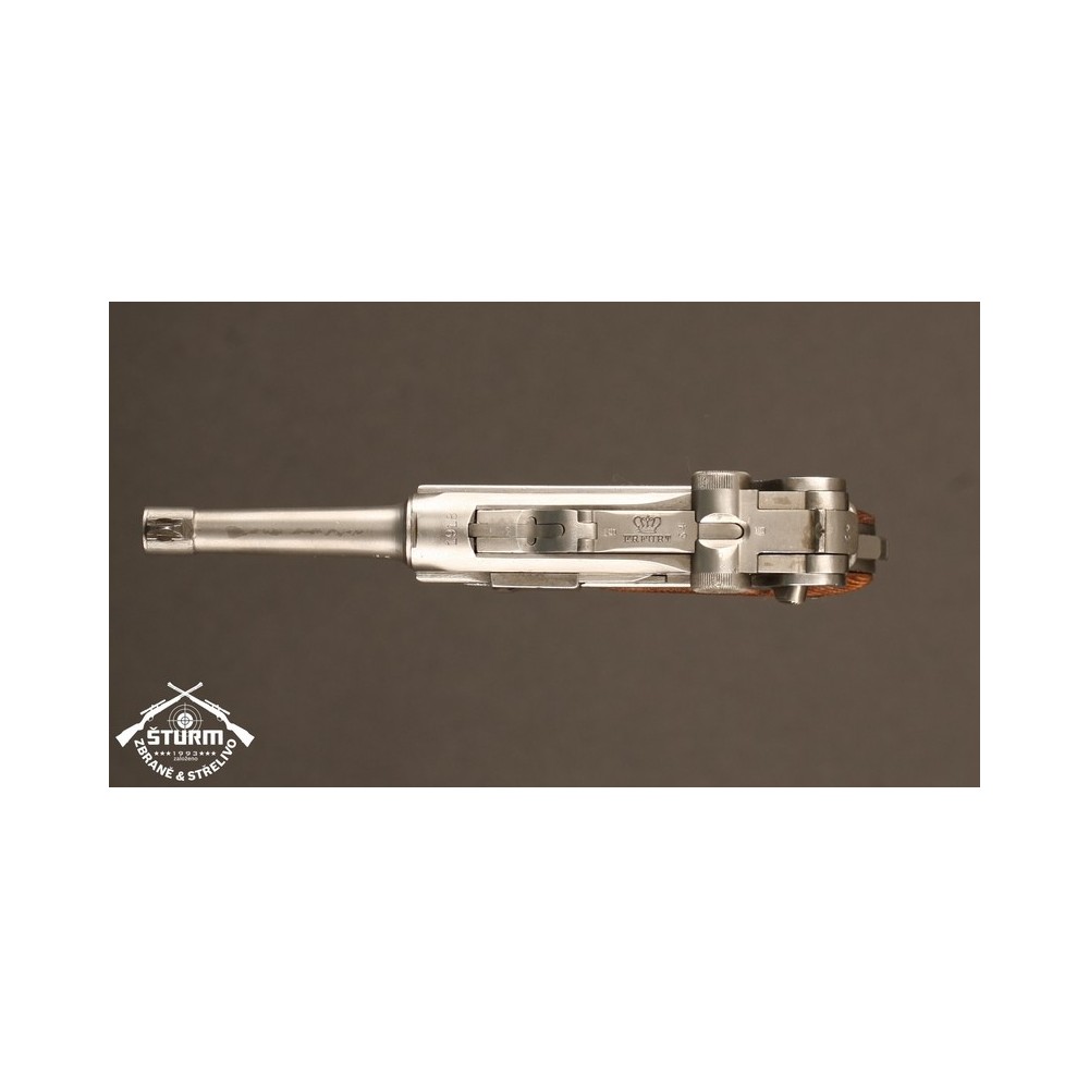 Pistole P08 ve vzácném, bílém provedení. Pistole není plně sčíslovaná, rám nese číslo 8985, závěr a jeho díly pak 54. Nicméně pistole je v perfektnéím stavu, s platnou zkušebnou (značeno skrytě).