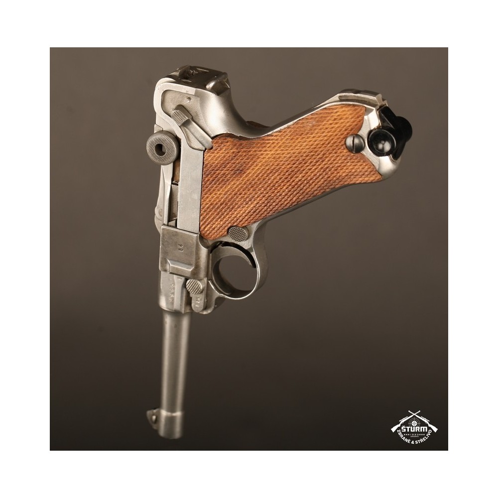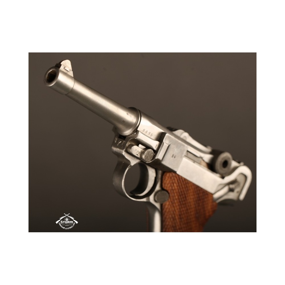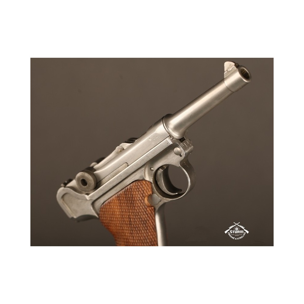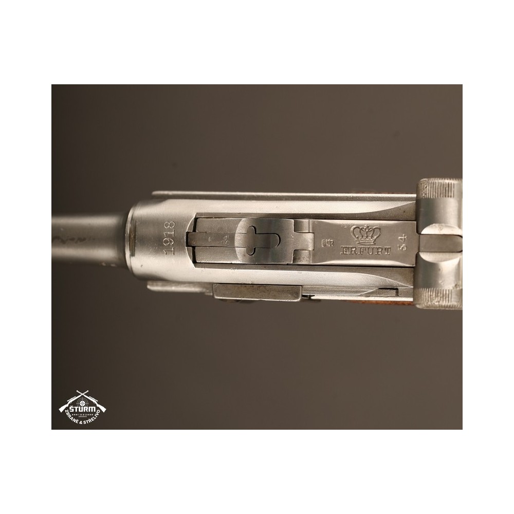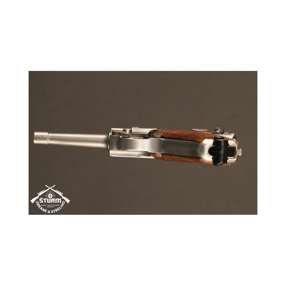 Pistole P08 ve vzácném, bílém provedení. Pistole není plně sčíslovaná, rám nese číslo 8985, závěr a jeho díly pak 54. Nicméně pistole je v perfektnéím stavu, s platnou zkušebnou (značeno skrytě).