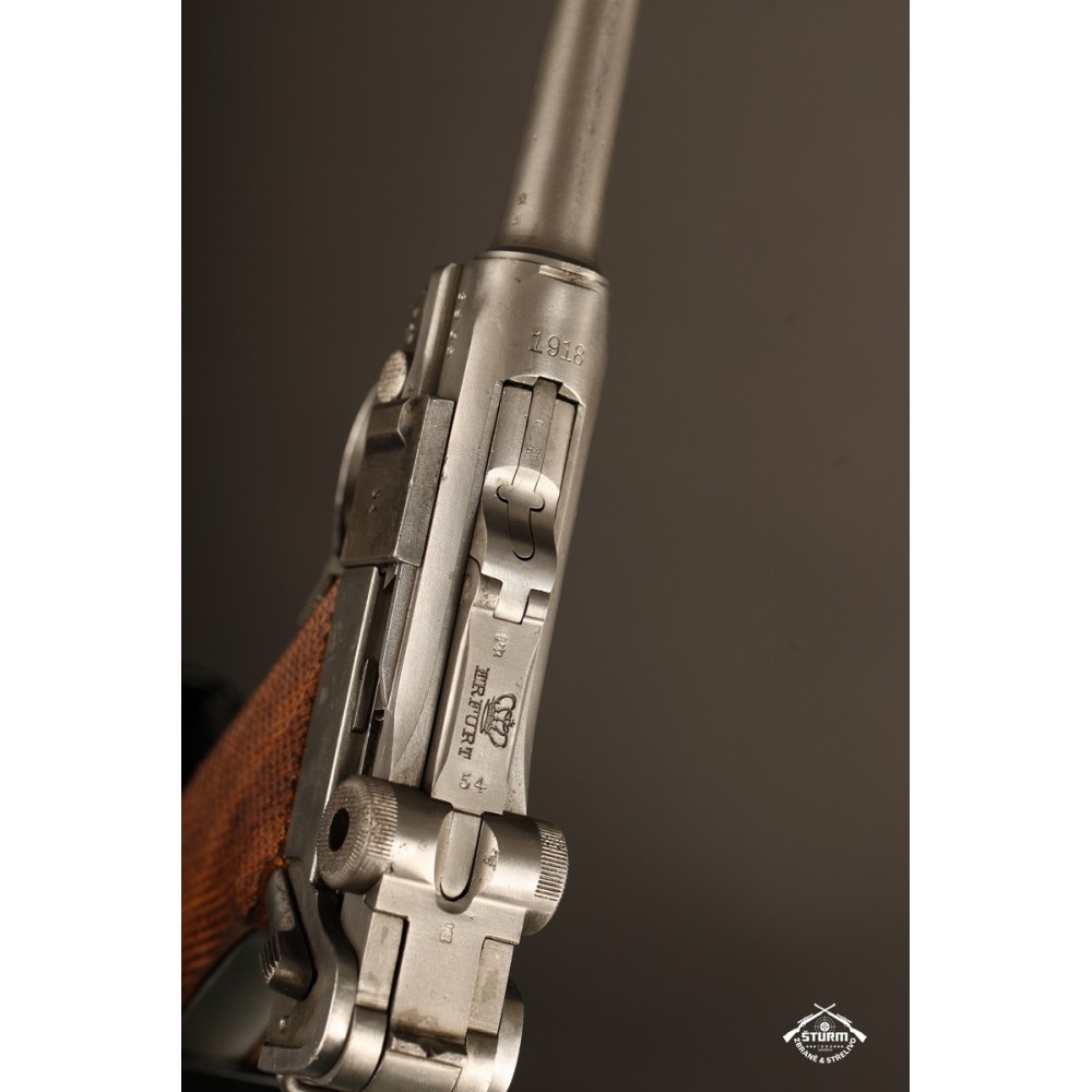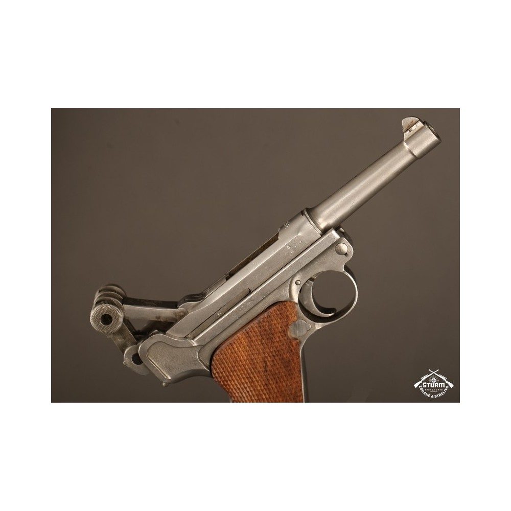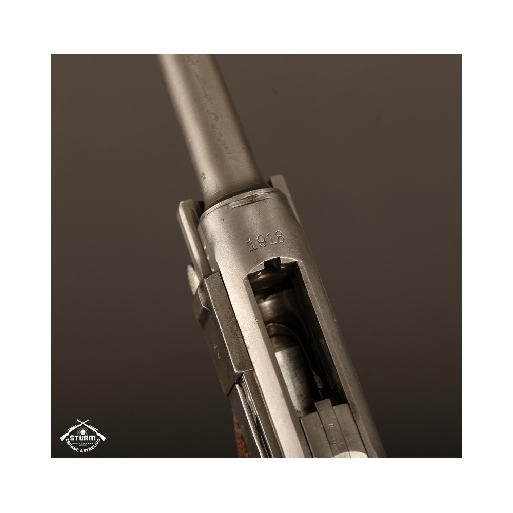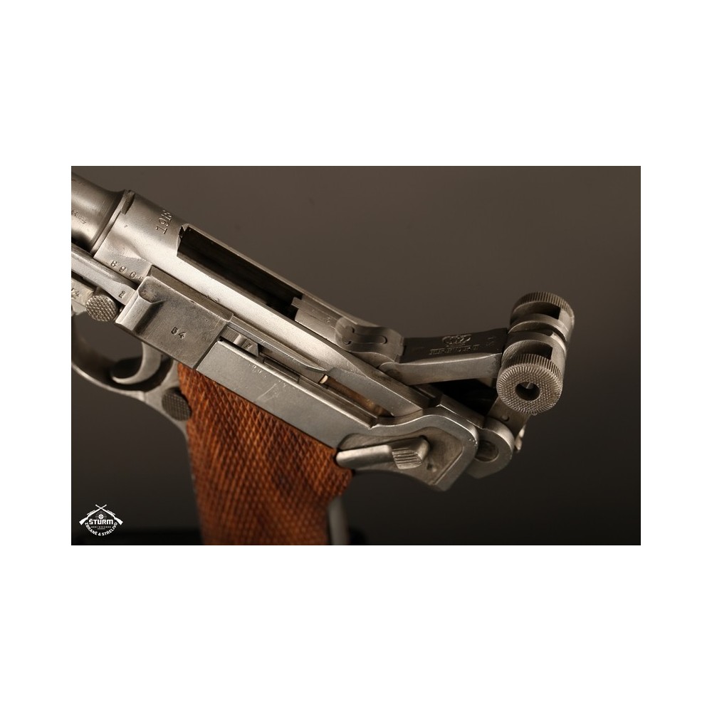 Pistole P08 ve vzácném, bílém provedení. Pistole není plně sčíslovaná, rám nese číslo 8985, závěr a jeho díly pak 54. Nicméně pistole je v perfektnéím stavu, s platnou zkušebnou (značeno skrytě).