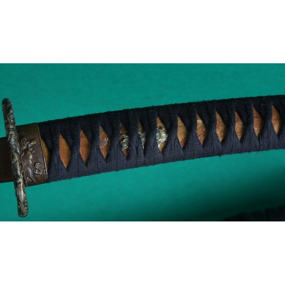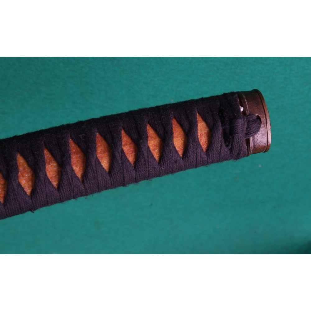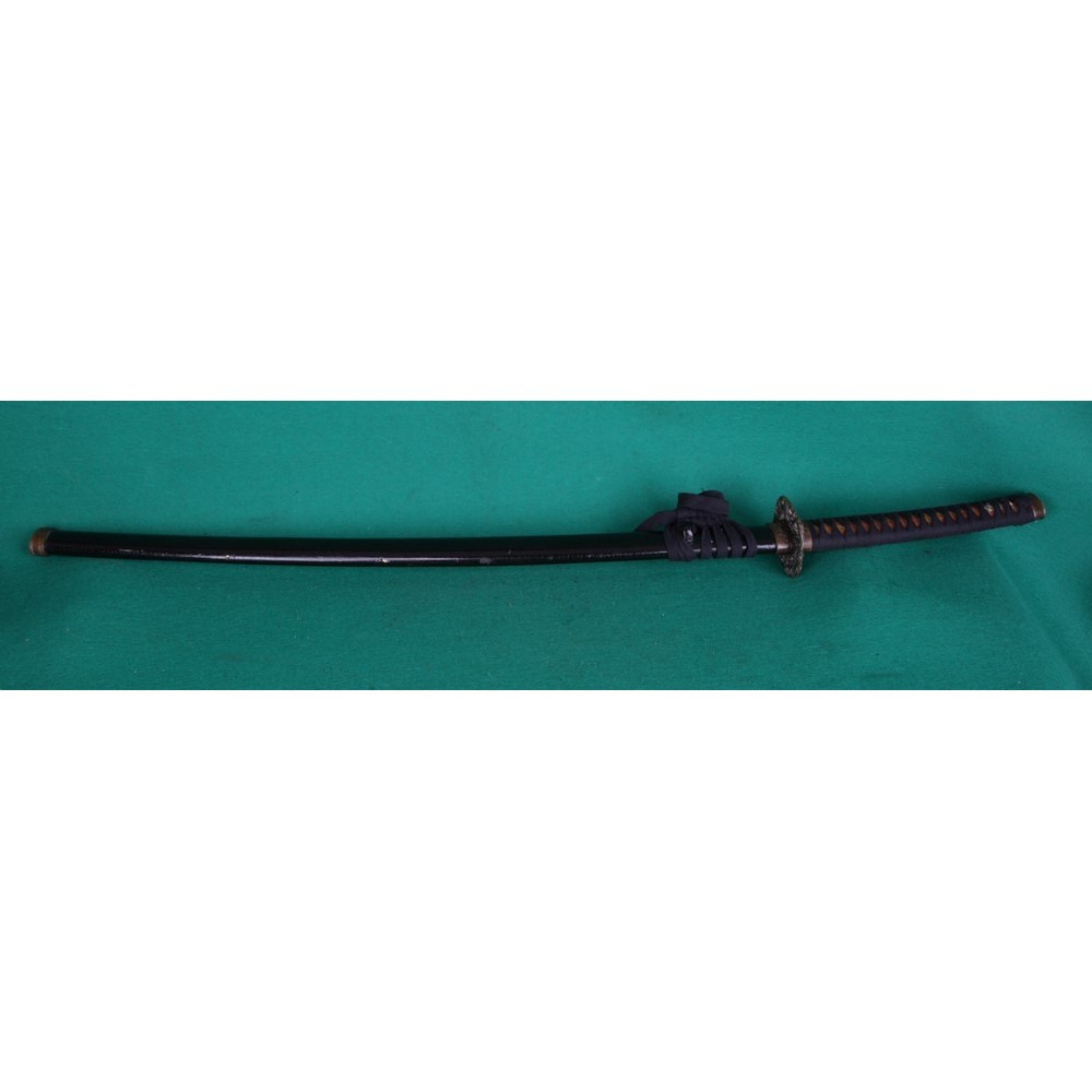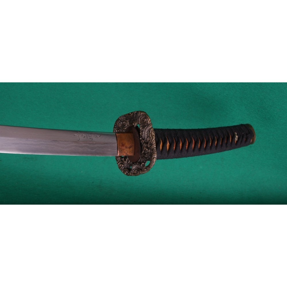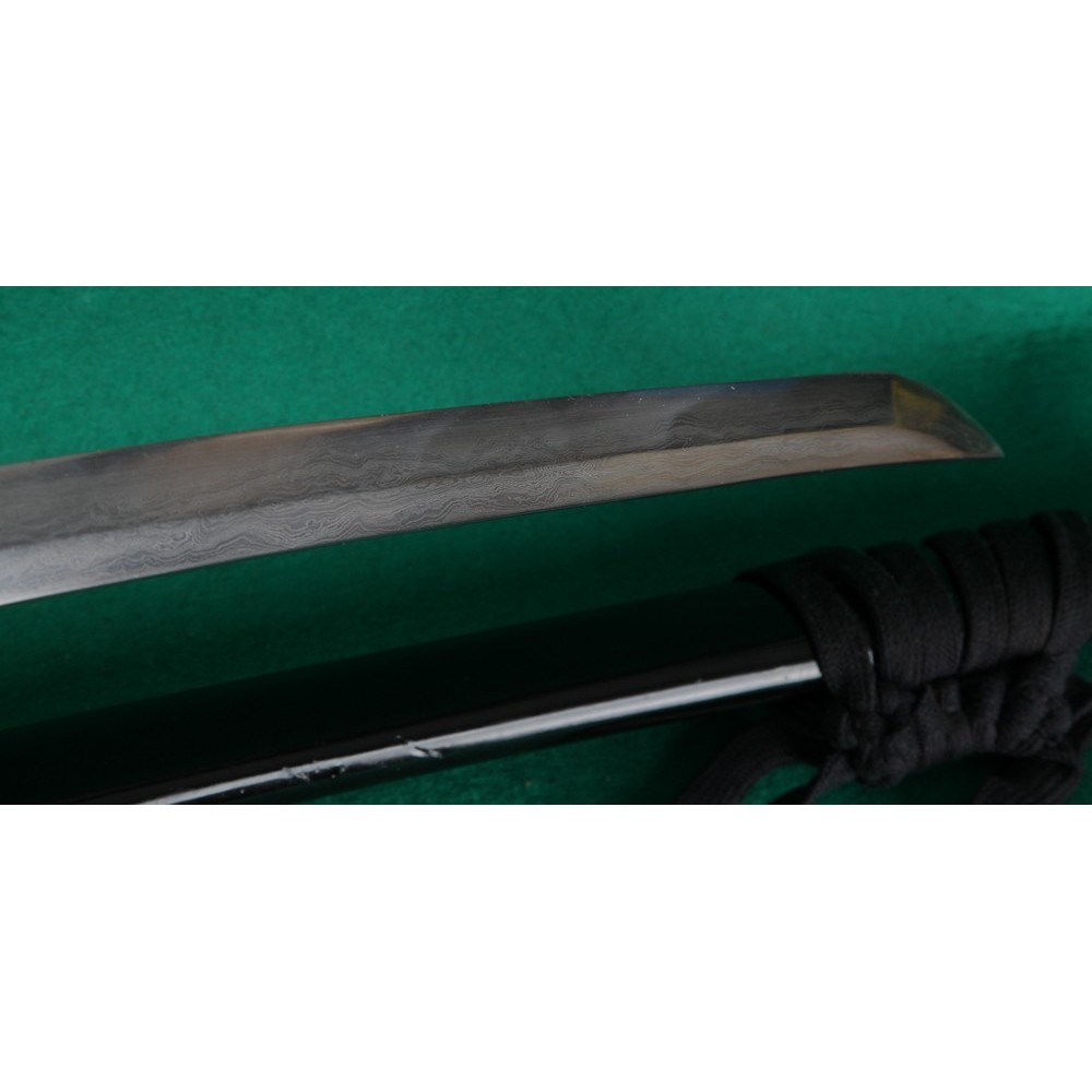 Velmi pěkně vyrobená replika japonské katany, dřevěná, černě lakovaná pochva, jinak naprosto bez koroze, bez jediného záseku na čepeli, prostě nová věc. Čepel je z velmi jemného damašku a je ostrá.