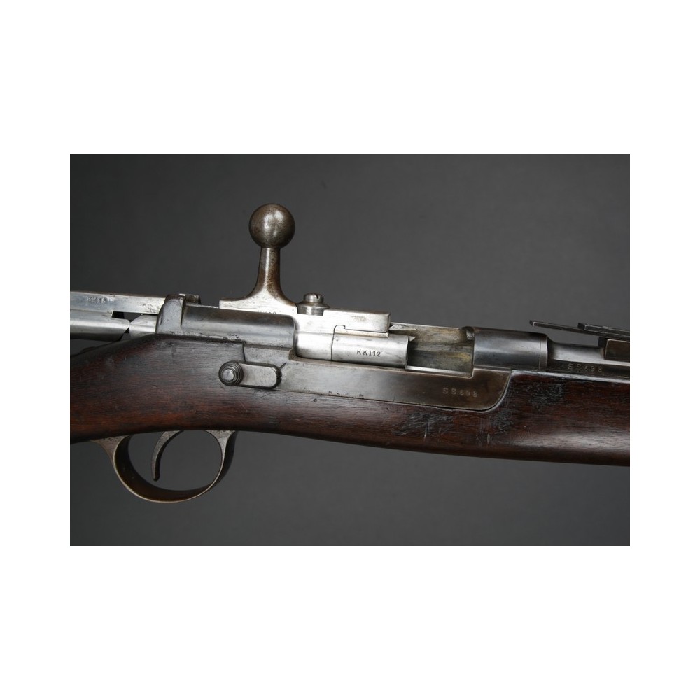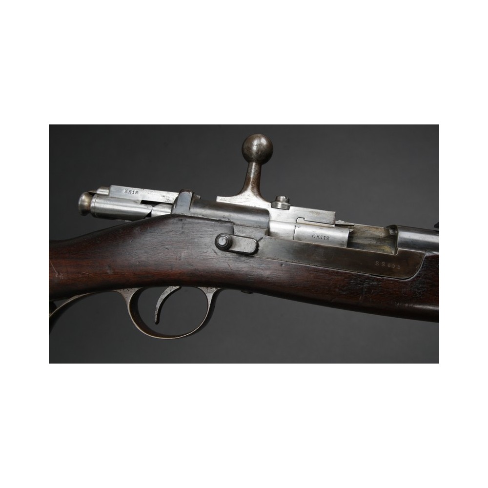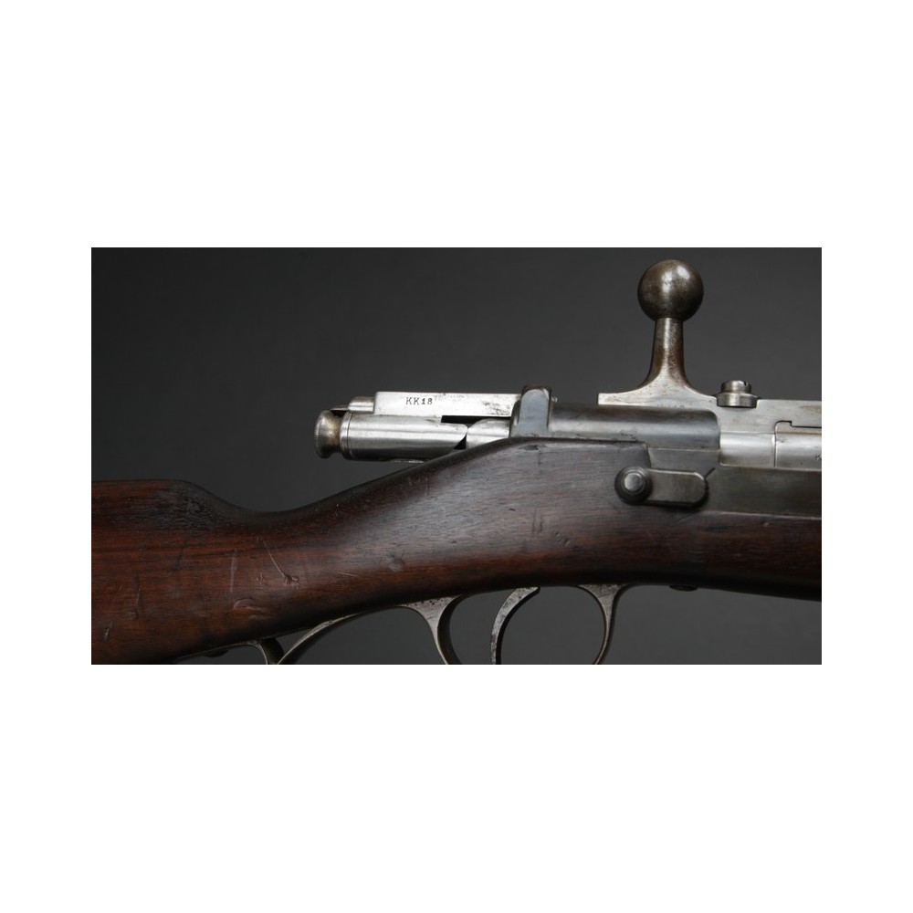 Velmi hezky zachovalý Kropatschek M.1886, plně funkční. Kovové části s historickou patinou, pažba velmi pěkná s výrazným původním značením. Závěr má bohužel jiné číslo.