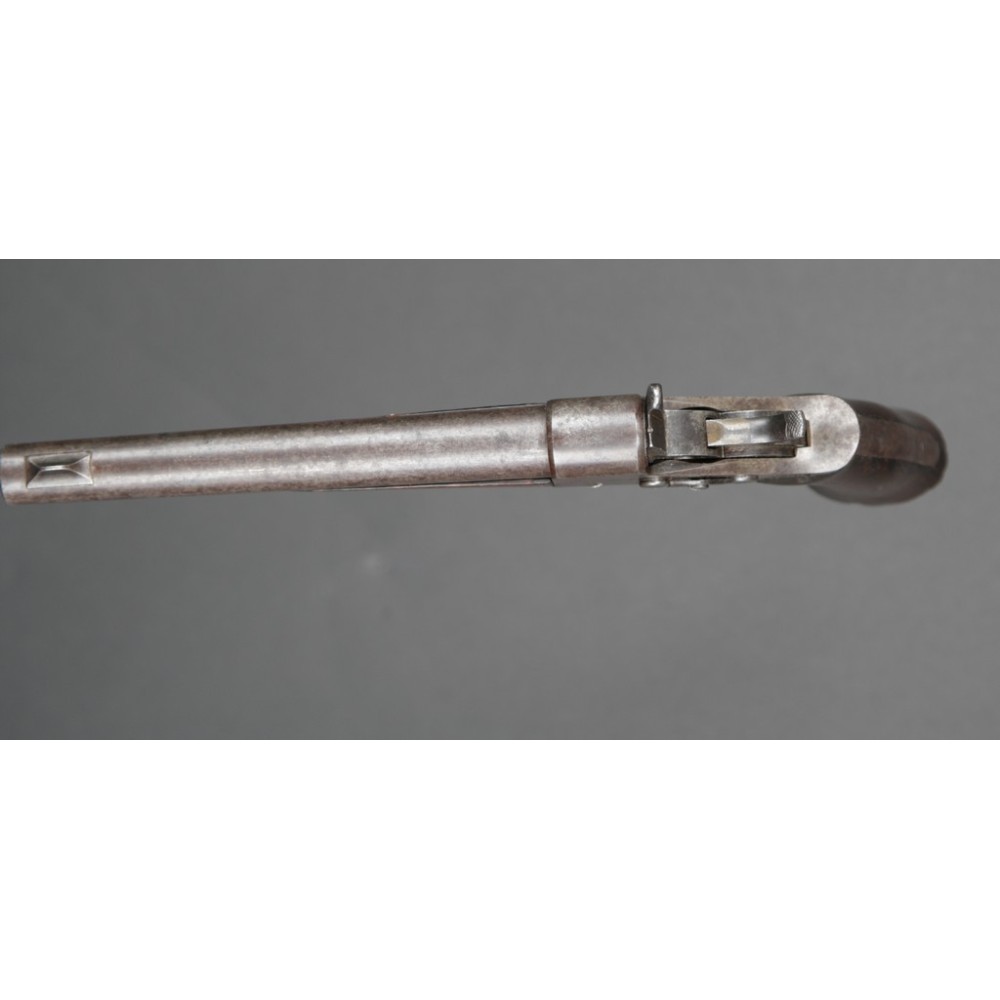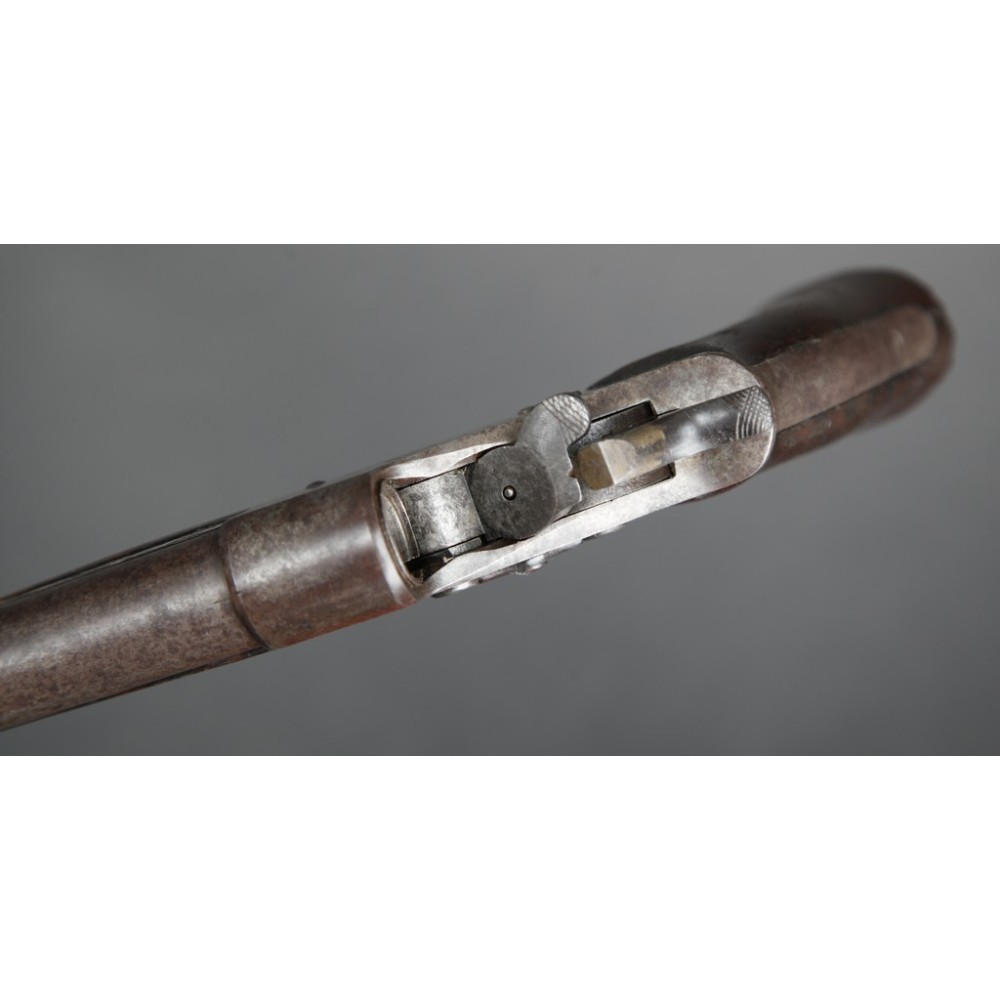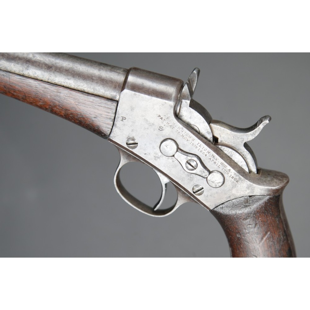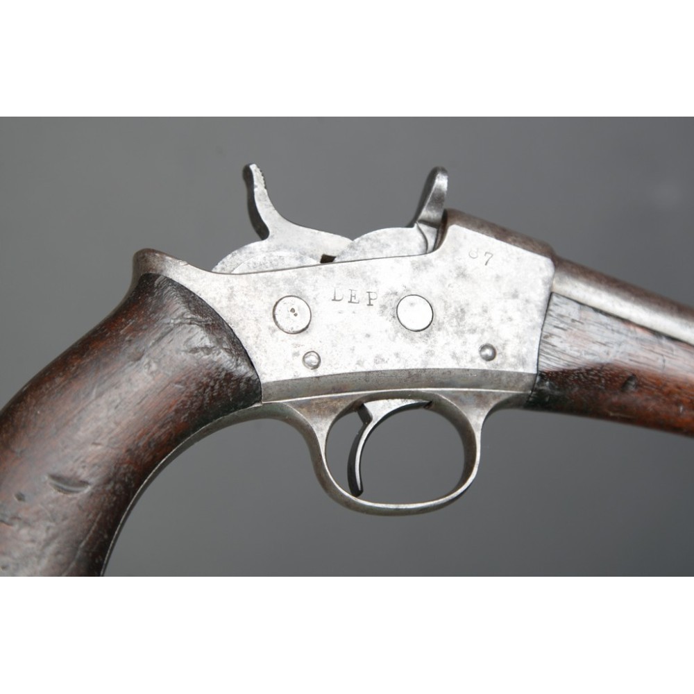 Jednoranná pistole Remington Rolling Block M.1874, ráže .50 Army CF, v.č. DEP 87. Jedná se o velmi zachovaou zbraň v komisním prodeji. Vývrt v hlavni má pistole skvělý, lesklý, drážky ostré a výrazné, mechanicky je v pořádku, bohužel ale zatím nemá platnou zkušebnu. Stopy používání odpovídající stáří zbraně, která prvděpodobně i sloužila v armádě. Přesto se dochovala ve výborném, střelby schopném stavu. Kovové části jsou zčásti kryty původním brynýrem, většinou ale historickou patinou. Pažbičky neponičené, zachovalé.